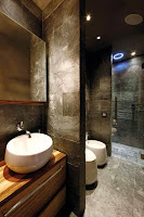 Amazing dull stone makes is grim and refined. Nights in this warmly lit home are cozy and loosening up. Imagine sitting here, the glass open to the outside, the cool wind blowing in and the sound of waves lapping the shore. Notwithstanding the way that unassuming, the lighting really highlights the surfaces and configuration characteristics of the dividers and uncovered square. In this house, the symbolization is fabricated right in! When you've got contrivances and finished like these, who needs a painting?! Here, the home legitimizes itself. The joined devouring table with textured divider are a point of convergence of merging in this living space. Through a look a-boo window, the kitchen is to a degree open to the straggling leftovers of the living domain. This outside devouring area has an indoor tasteful, with a wood consuming table set on a round wood floor, and a light hanging overhead. Minimalist Seafront House Design With Inconspicuous Exterior Artfully Conceals Ultra-Modern